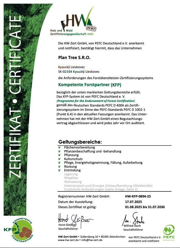 Naša spoločnosť Plan Tree s.r.o. je certifikovaná podľa systému PEFC Kompetente Forstpartner (KFP), ktorý je uznávaný organizáciou PEFC Deutschland e. V.